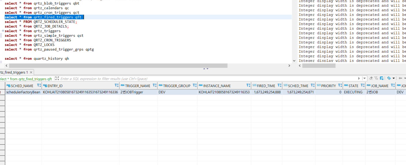 - TestCronJob2 : @DisallowConcurrentExecution 을 통해 동기화 보장 테스트용 스케줄은 10초단위로 돌면서 쓰레드슬립을 15초로 설정