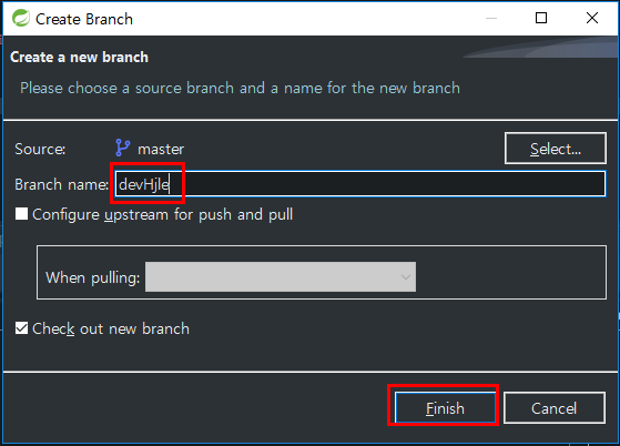 - 생성할 브랜치(devHjlee) 명 작성 후 Finish