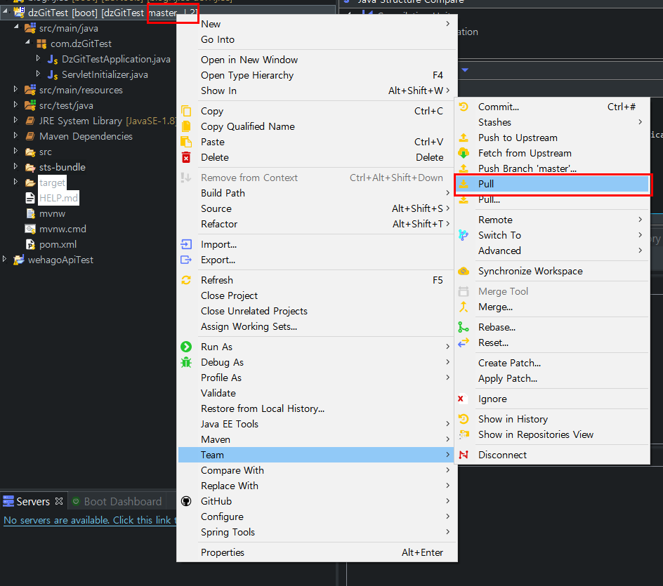 - 이클립스로 돌아가서 Switch to 로 master로 변경 후 Team > synchronize workspace 를 하게되면 아래처럼
