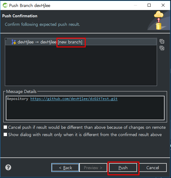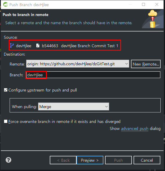 3. 생성한 브랜치(devHjlee)를 Remote Repository 에 Push