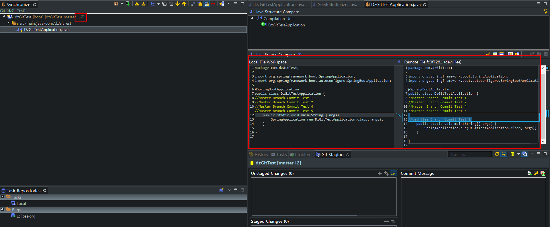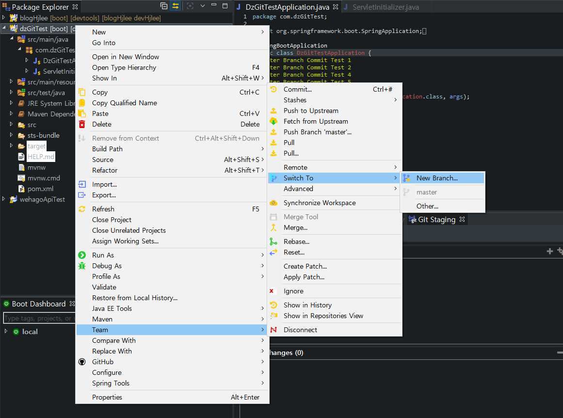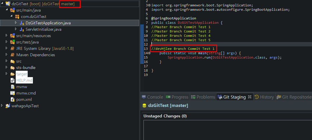 - DzGitTestApplication.java 에서 //devHjlee Branch Commit Test 1 주석을 추가 후 Commit