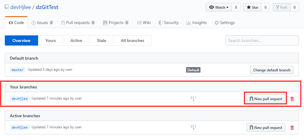 - 위에 화면처럼 Push 를 진행하고 Github Branch 목록을 보면 devHjlee 브랜치가 추가된것을 확인할 수 있다.