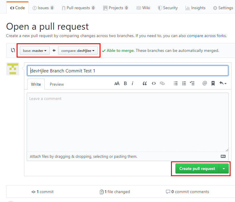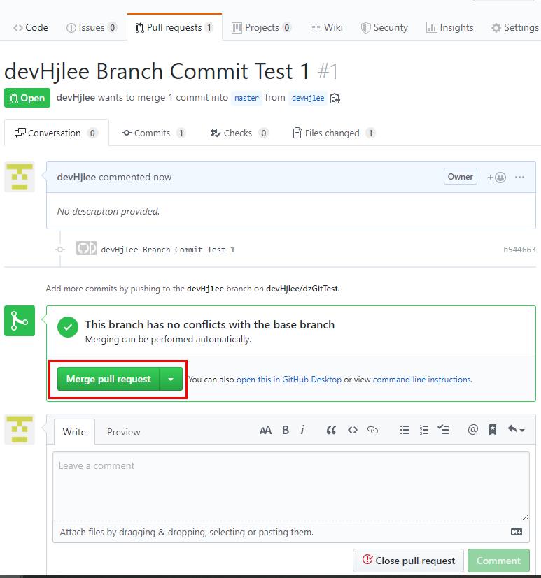 - 그림9 에서보이는 New Pull requset 를 클릭 후 아래그림11 에서처럼 base:master <- compare:devHjlee를 확인한 후 Create pull request 를 진행하면 그림12 와 같이 Merge pull request 가 보이고 클릭하게되면