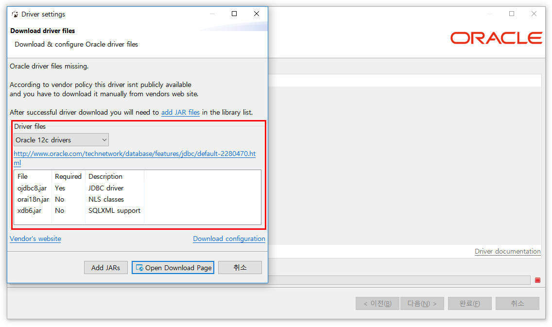 Oracle driver가 없어서 위에 그림에서처럼 Oracle driver를 다운로드 받을수 있는 url을 제공해준다.