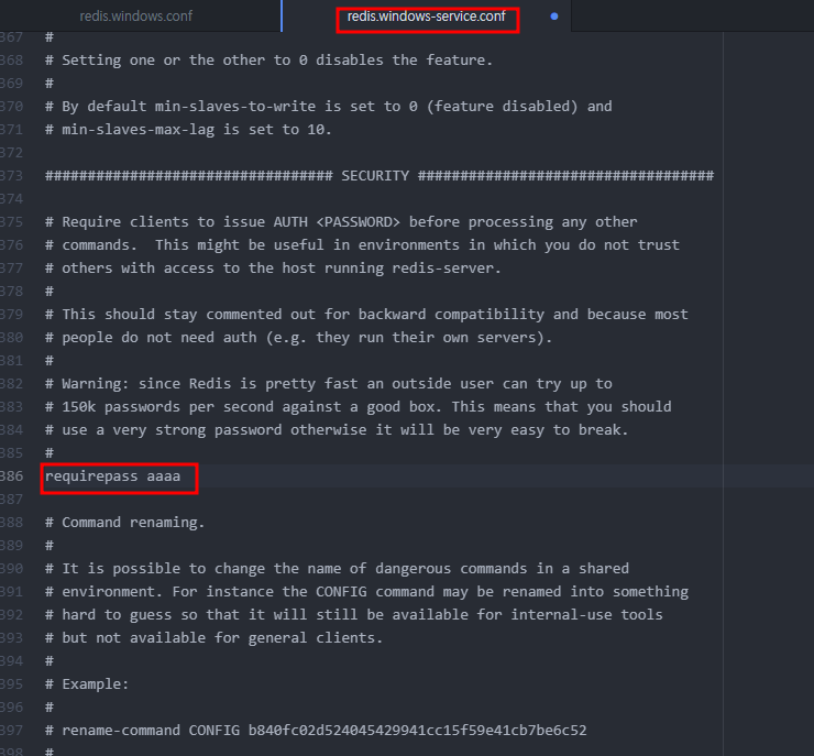 설치했던 경로에 redis.windows-service.conf 파일을 열고 #requirepass 로 되어있는 부분으로 이동 뒤