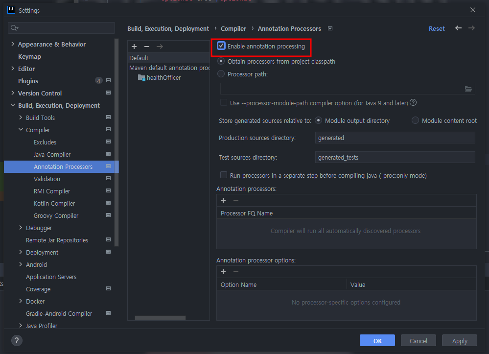 - File -> settings -> Build. Execution, Deployment -> Compiler -> Annotation Procssors -> Enable annotation processing 체크