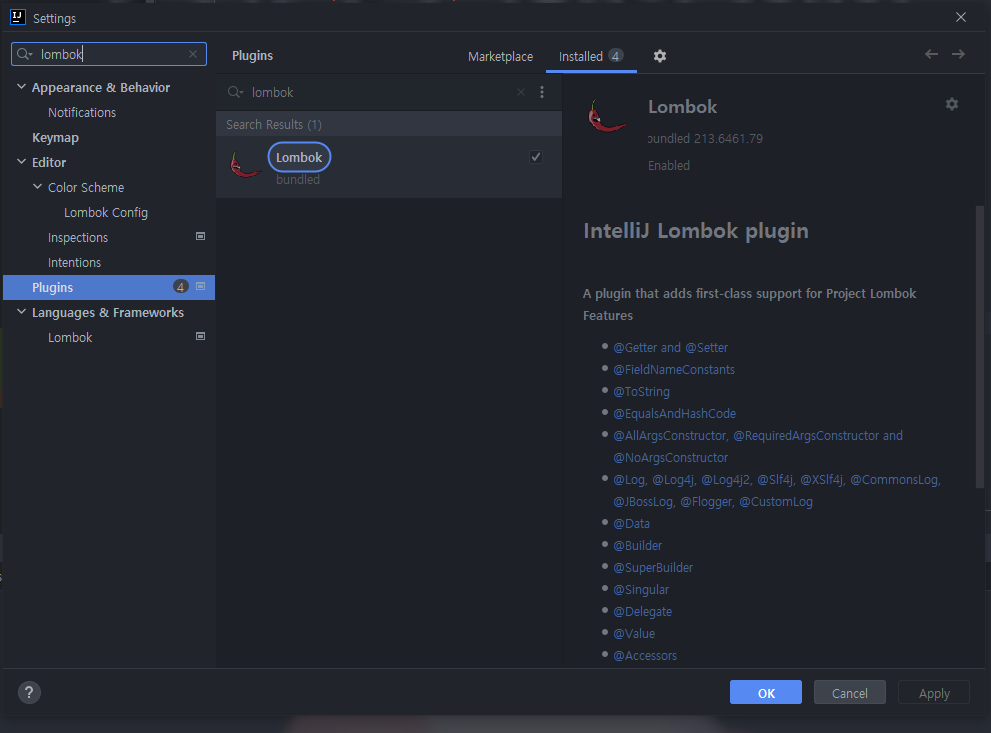 - file -> settings -> Pluings : Lombok 검색 후 Install 및 IDE 재시작