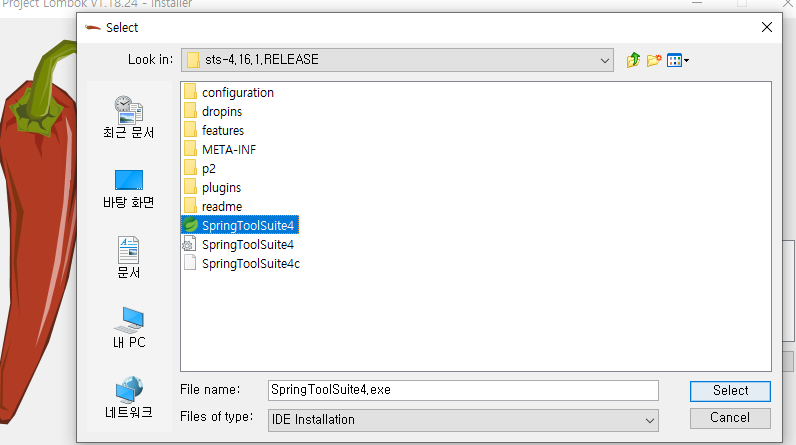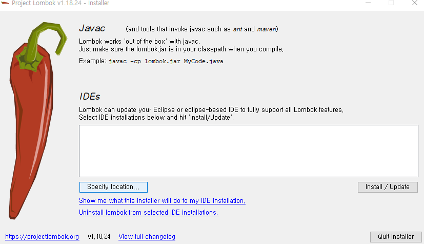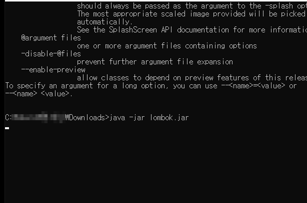 - Lombok.jar 다운로드를 후 cmd를 열어 java -jar lombok.jar 를 실행