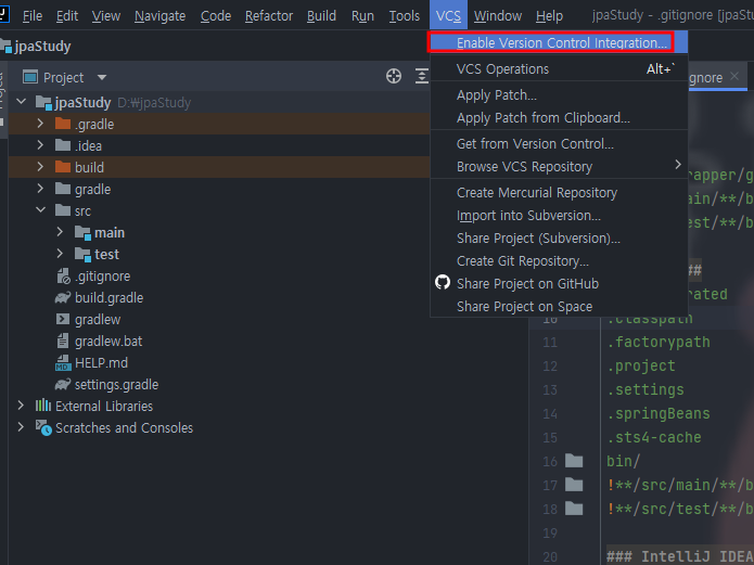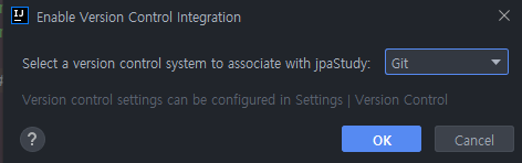 1) Enable Version Control Integration... 클릭 후 Git 선택 하고 OK 진행