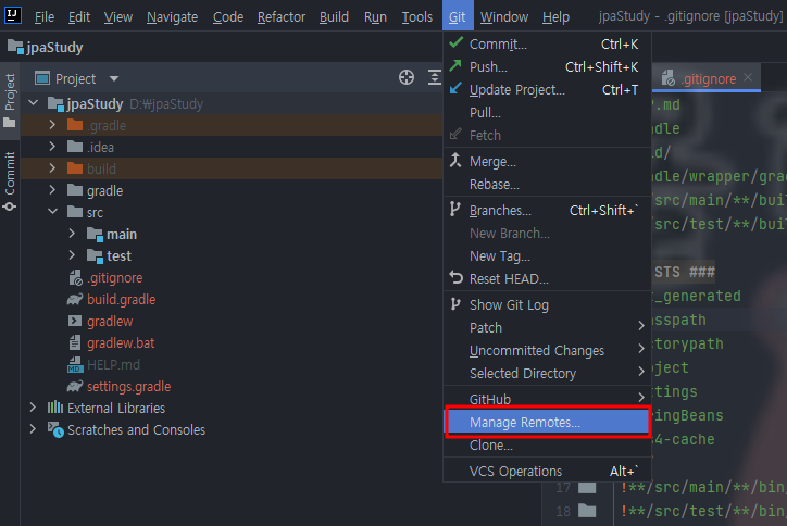 2) Commit 탭에 파일들을 확인하고 Git >> Manage Remotes.. 선택후