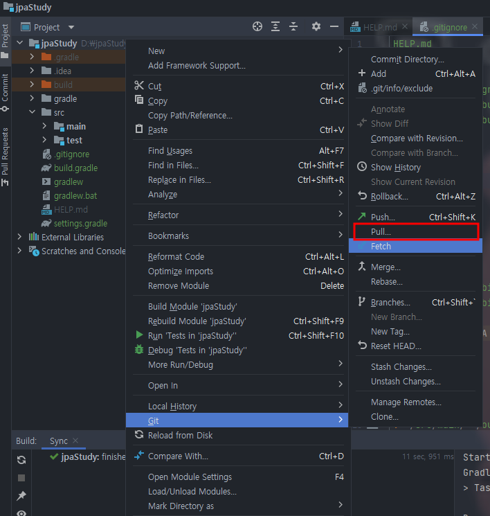 3) jpaStudy 프로젝트에서 Git >> Pull 진행