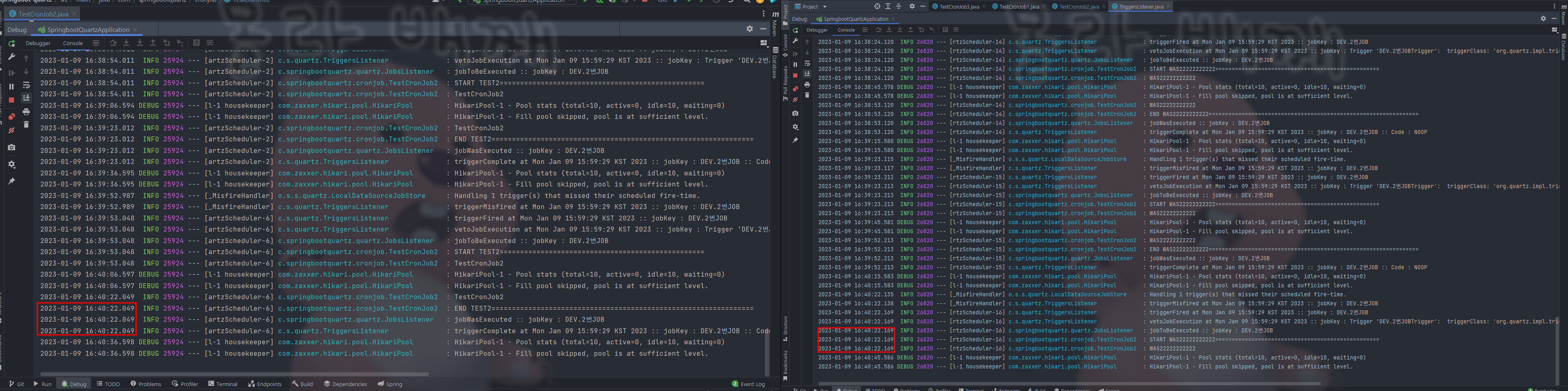 - TestCronJob2 : @DisallowConcurrentExecution 을 통해 동기화 보장 테스트용 스케줄은 10초단위로 돌면서 쓰레드슬립을 15초로 설정