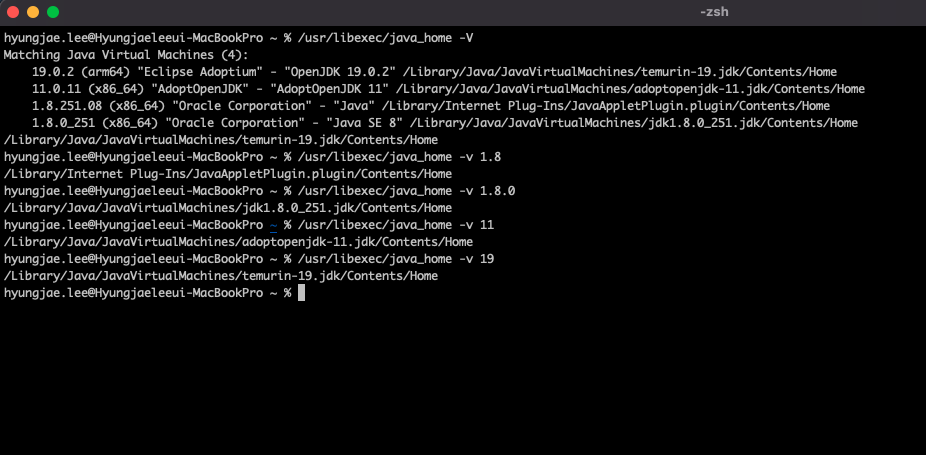 2.) /usr/libexec/java_home -v 1.8.0, 11, 19 명령어로 해당 java 버전들이 설치된 경로를 확인 (저는 1.8.0 이랑 1.8이랑 다르기에...)