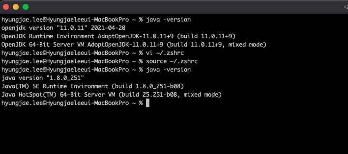 위에 처럼 세팅 후 source ~/.zshrc (or bashrc) 를 실행하여 적용 후 java -version 명령어를 통해 버전확인