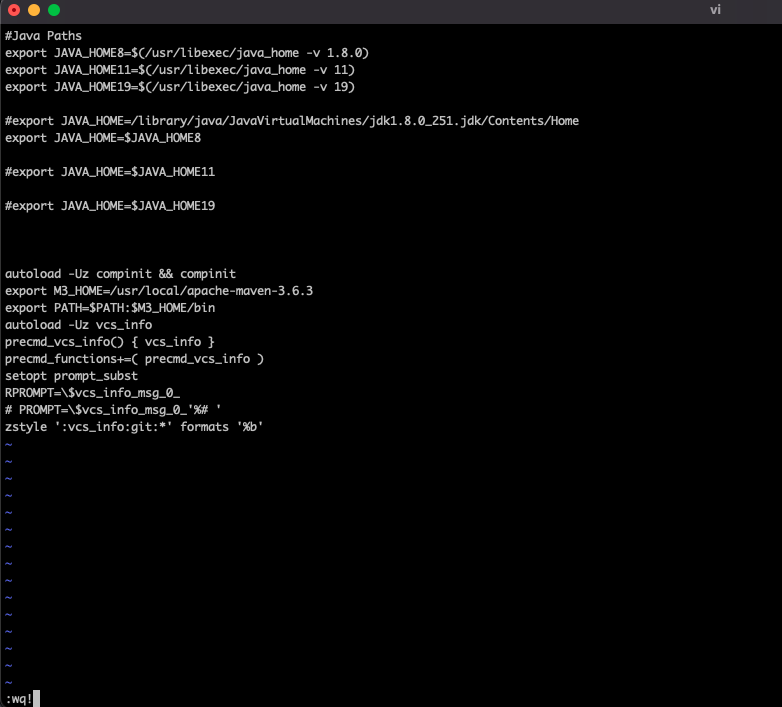 3.) vim ~/.zshrc(or bashrc) : 해당 파일을 편집모드로 들어가 아래와 같이 JDK 버전별 경로 및 JAVA_HOME 설정