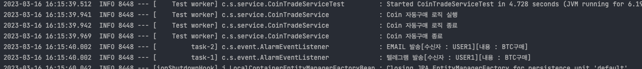 - 위에 사용하던 소스에서 CoinTradeService 와 AlarmEventListener 단순한 테스트를 위해 Save 로직추가