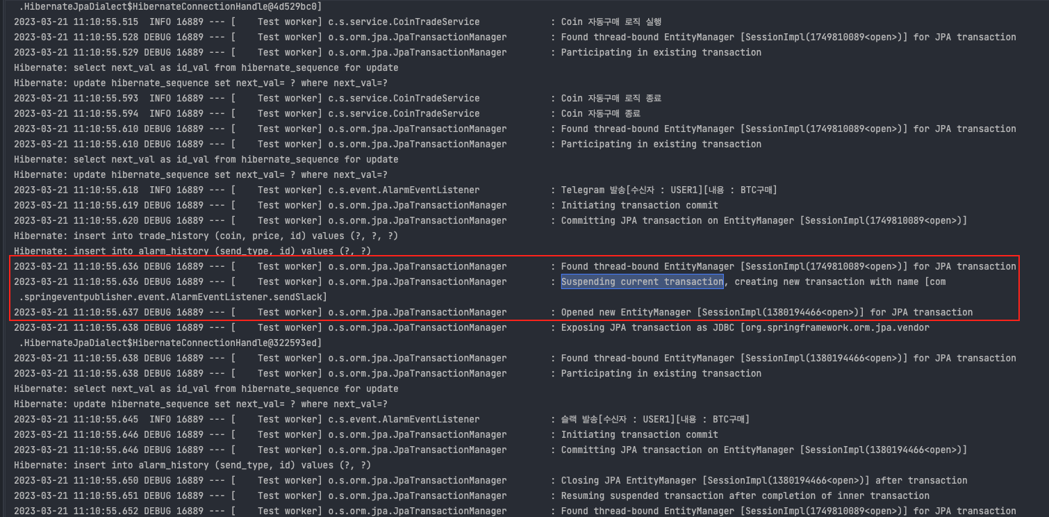 예시 : 정상적인 흐름이나 슬랙이벤트에 REQUIRES_NEW 주석처리