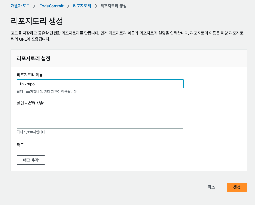 - AWS Management Console을 통해 간편하게 새로운 Git 저장소를 생성합니다.