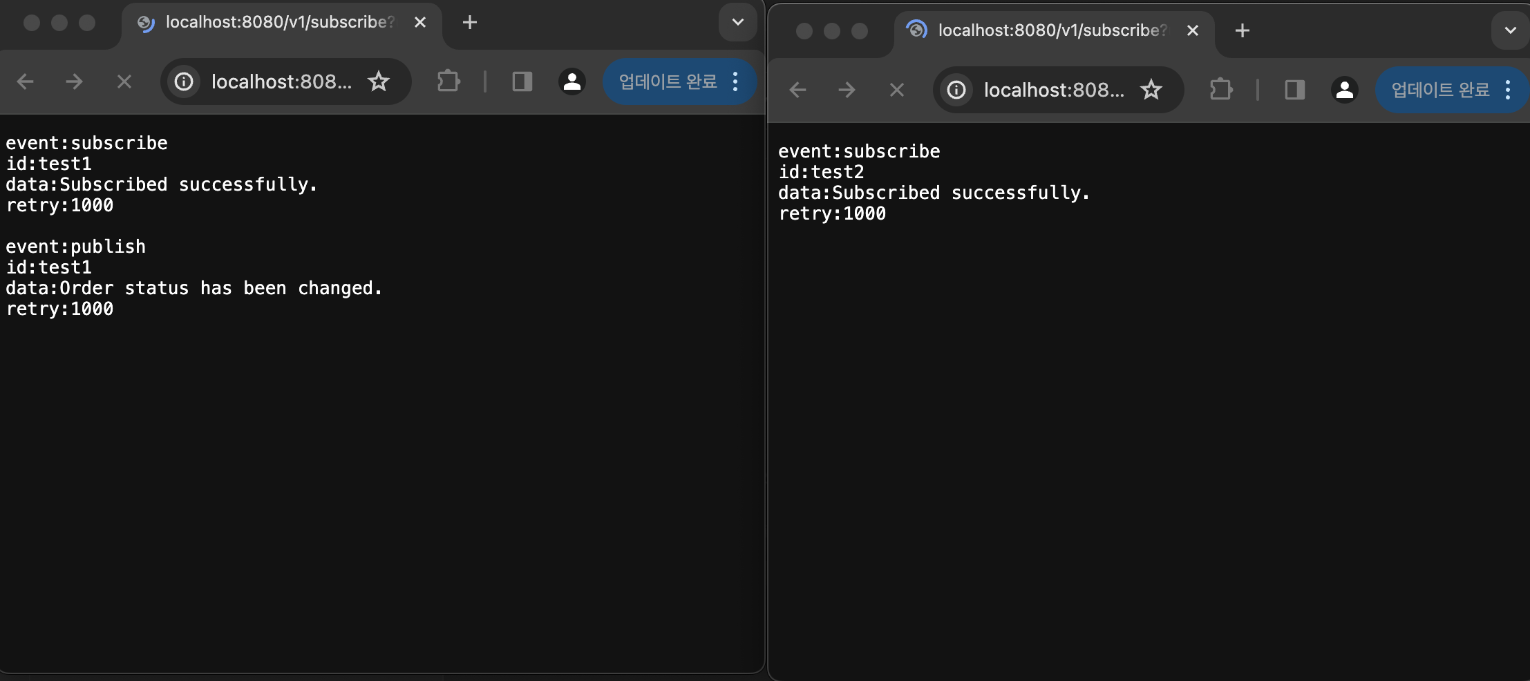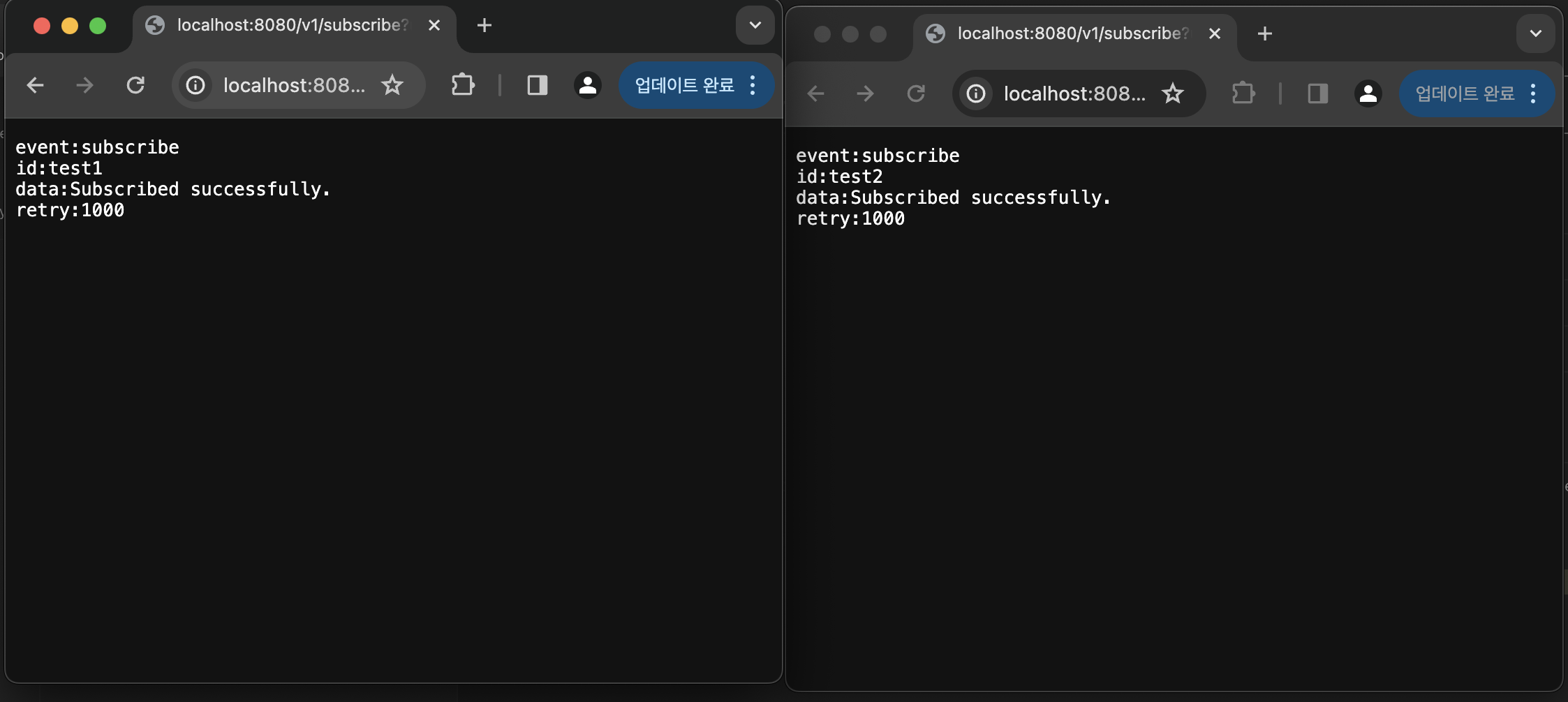 브라우저에서 각각 UserID: test1, test2 로 /v1/subscribe 를 통해 구독