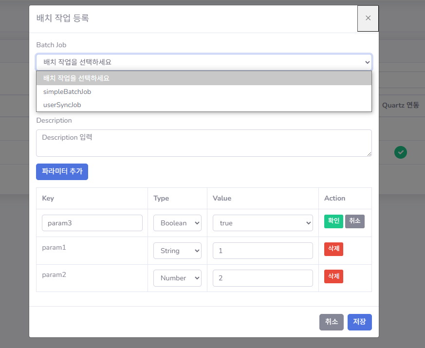 - 배치 관리: 배치 작업 등록, 수정, 즉시 실행, 파라미터 관리