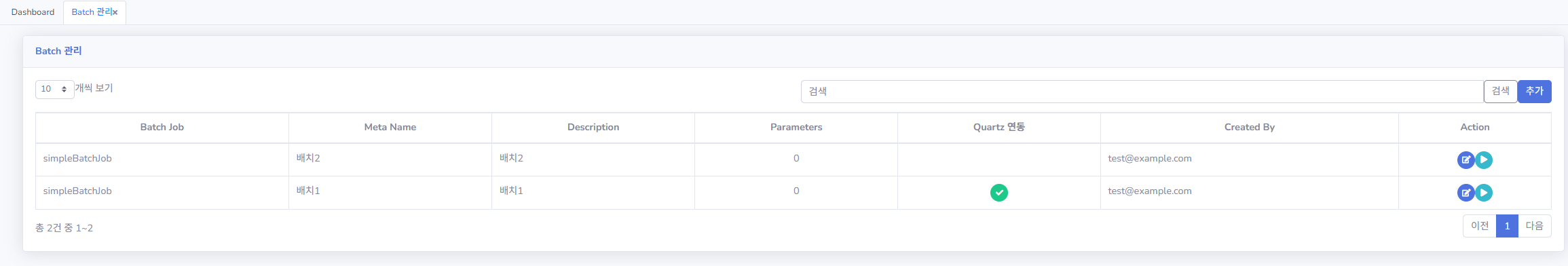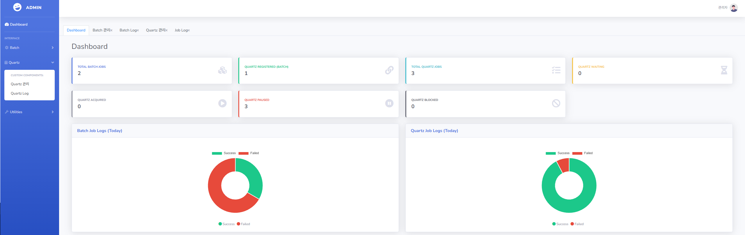 - 대시보드: 배치/Quartz 작업 현황 및 성공/실패 통계 시각화