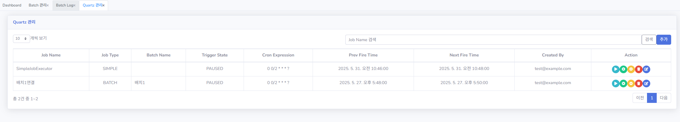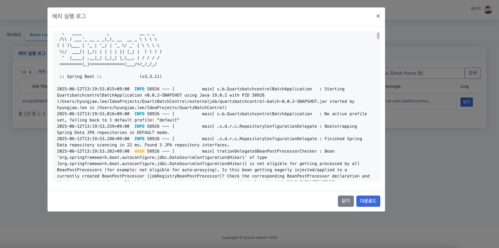 - Quartz 로그: Quartz 작업 실행 이력 및 상세 로그 확인