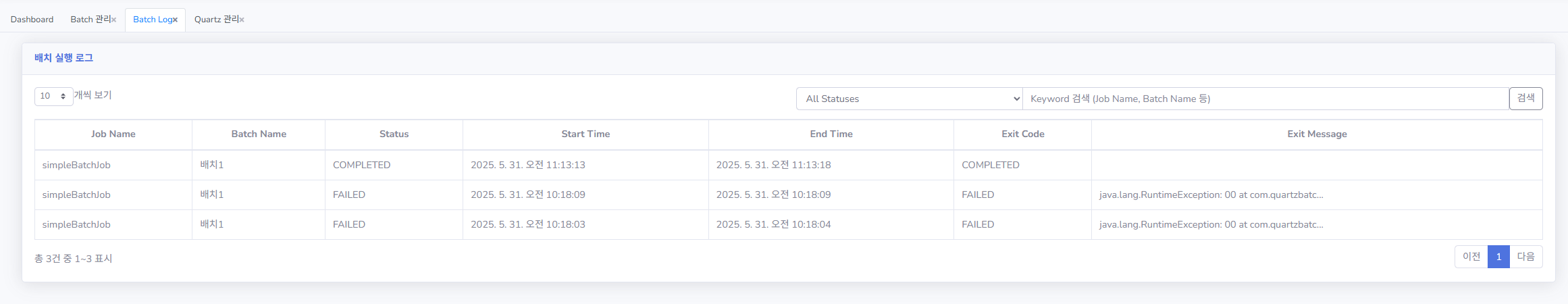 - 로그 관리 강화: 배치 프로젝트에 로그 관리를 위한 리스너(BatchJobExecutionListener)가 기본 설정되어 있어, 배치 실행 시 로그가 자동으로 관리됨 (다중서버일 경우 외부 저장소 필요)