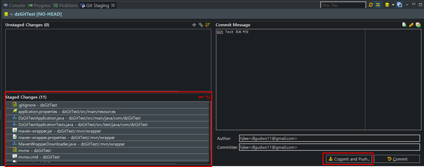 - Git Staging :변경된 소스목록을 Unstaged Changes 에서 staged Changes로 이동 시킨후 Commit and Push... 클릭