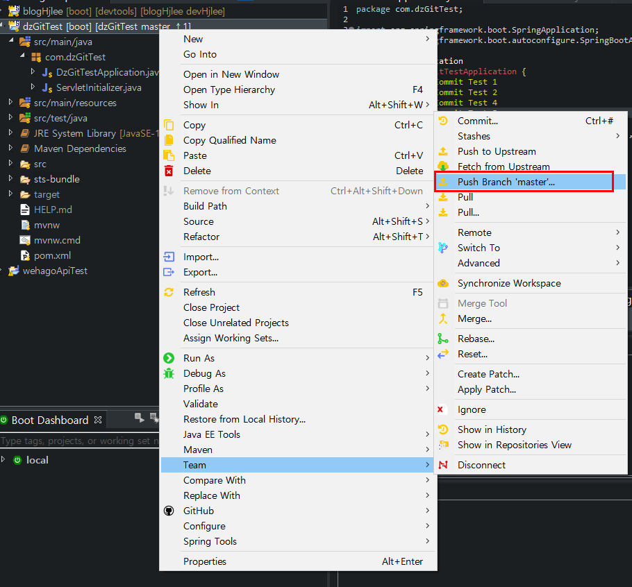 - 아래 화면에서 DzGitTestApplication.java 에 주석을(Master Branch Commit Test 1) 추가 후 Commit and Push 진행