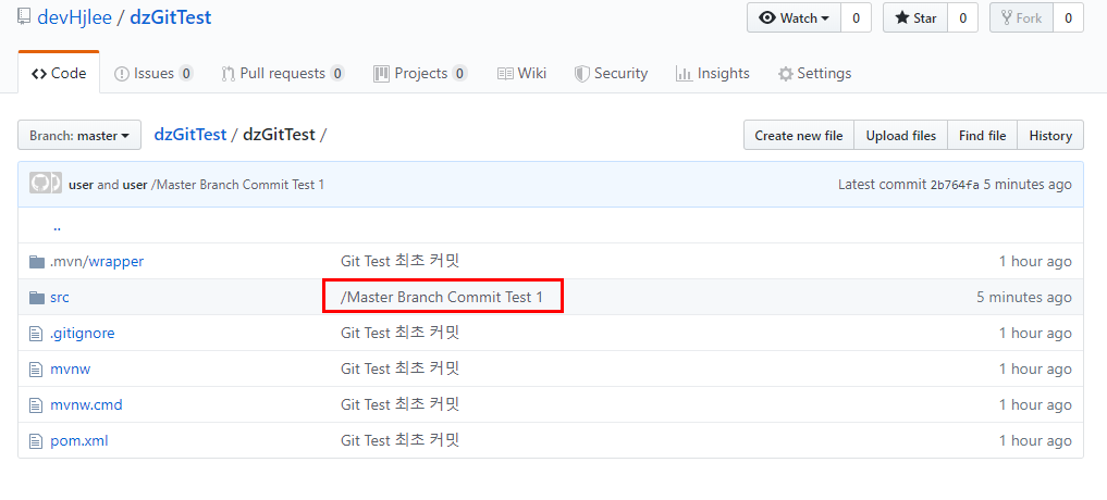 4. 연동된 Git Repository (dzGitTest) 에 첫 Commit